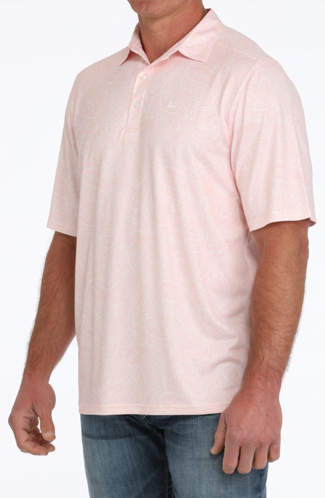This pink printed polo by Cinch is perfect for spring. This polo features a light weight, moisture wicking poly spandex fabric, white buttons and a heat transfer logo.