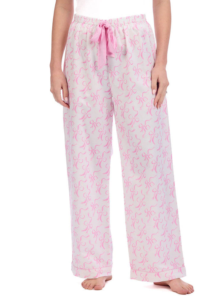 Sweet dreams start with these pretty pink bow pajama pants. Featuring a relaxed fit, silky feel, and an adjustable ribbon waist, they're perfect for lounging in style and comfort.