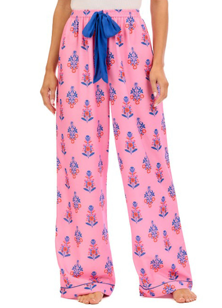 Relax in effortless style with these soft, lightweight pajama pants featuring a vibrant pink base and an allover floral print in rich blue and orange tones. Designed with a comfortable elastic waistband and adjustable tie detail, they offer a flattering, easy fit perfect for lounging, sleeping, or cozy nights at home.