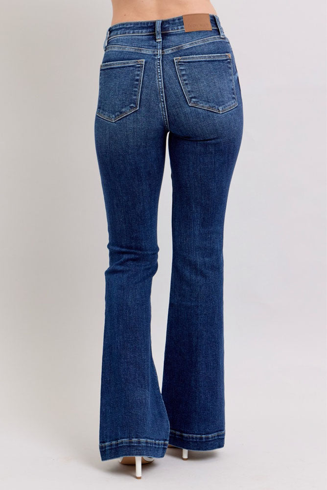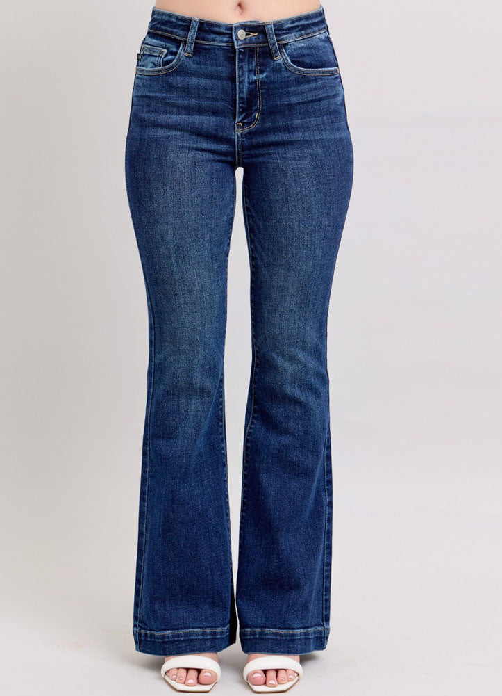 Flattering, timeless, and designed to move with you, these classic high-rise flare jeans are a must-have for any denim collection. Crafted from premium stretch denim, they offer a comfortable yet supportive fit through the waist and hips before flowing into a beautifully balanced flared leg. The rich medium-wash finish adds versatility, making them easy to dress up with heels and a blouse or keep casual with sneakers and a tee. Thoughtful details like classic five-pocket styling, a zip-fly closure, and subtle fading enhance their everyday appeal while maintaining a polished look. Perfect for elongating the leg and creating a flattering silhouette, these jeans transition seamlessly from daytime errands to evenings out. Whether paired with cozy knits, fitted tanks, or structured jackets, they deliver effortless style and comfort you'll reach for again and again, making them a dependable staple in your wardrobe.
