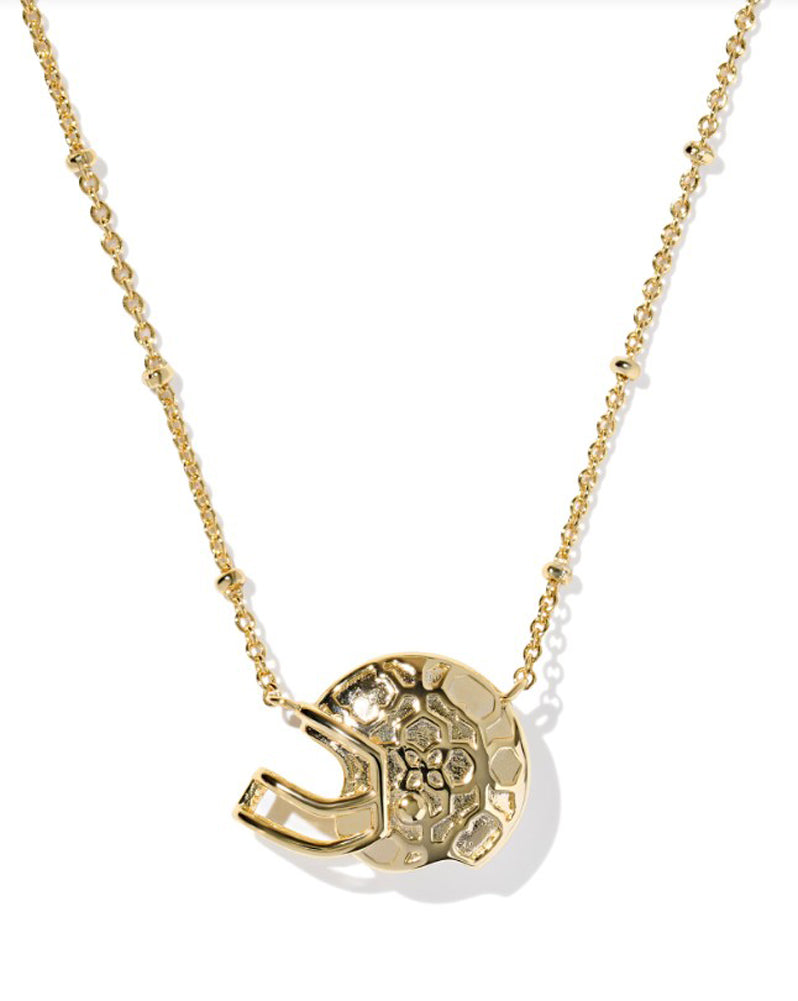 Show your team spirit in style with this reversible Kendra Scott football helmet necklace, featuring luminous mother-of-pearl on one side and an intricately textured gold design on the other, perfect for game day or everyday wear.