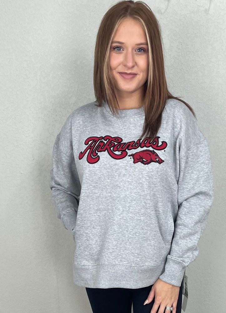 Show your team spirit in this classic heather gray crewneck sweatshirt featuring bold red “Arkansas” script and the Razorbacks logo. Designed with a relaxed fit and soft fleece interior, it's perfect for game days, campus wear, or cozy casual outings. A timeless fan favorite, this sweatshirt pairs effortlessly with jeans, leggings, or joggers for a spirited and comfortable look.