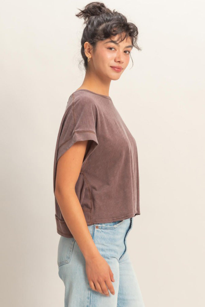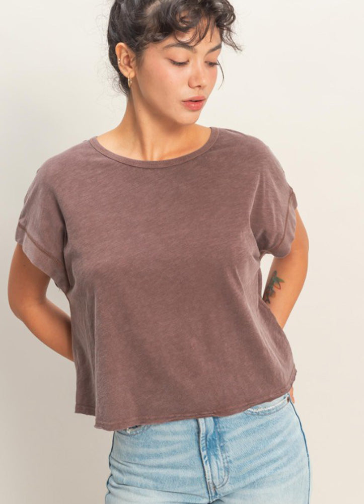 Effortlessly cool and perfectly lived-in, this cropped crewneck tee is the ultimate staple for a relaxed, everyday wardrobe. The shirt features a soft, slub-textured fabric in a muted mauve-brown hue, offering a vintage feel that pairs seamlessly with classic light-wash denim.