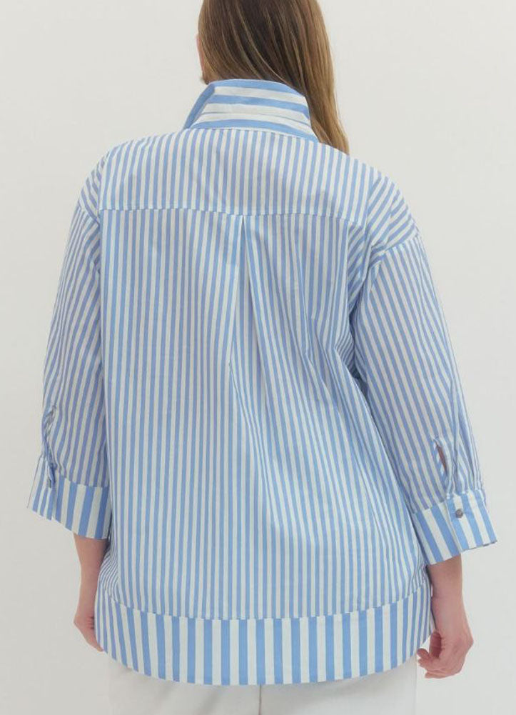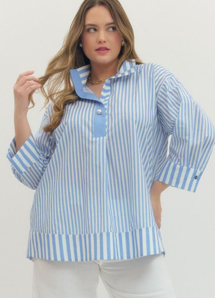 Plus Striped 3/4 Sleeve Top with Wide Collar in Blue by Entro