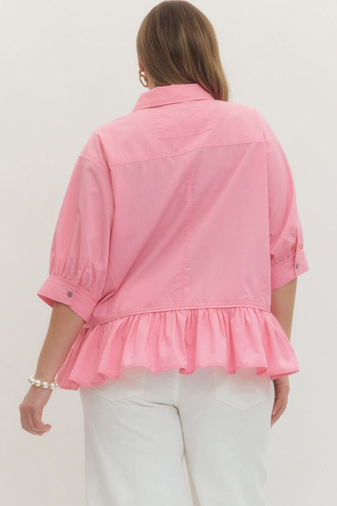 Plus Solid 3/4 Sleeve Button Down Ruffle Hem Top in Pink by Entro