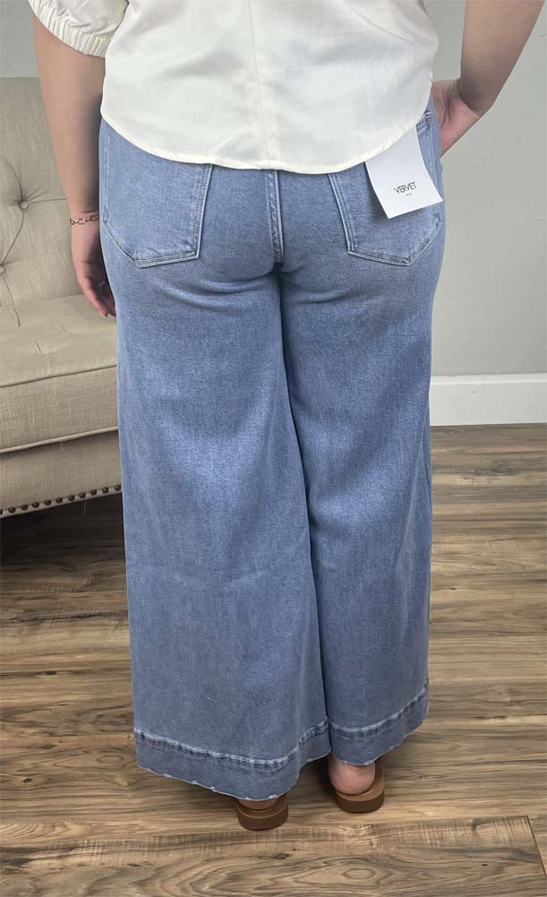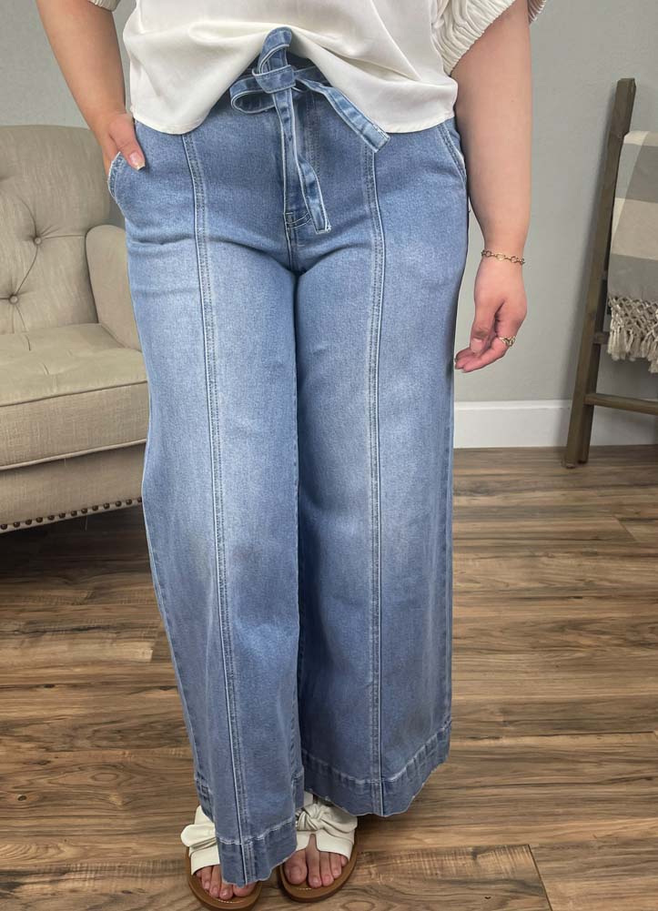 Effortlessly chic and endlessly comfortable, these wide-leg denim pants are a standout staple for any wardrobe. Designed with a flattering high-rise fit and a self-tie waist detail, they combine structure with a soft, relaxed feel. The light wash gives them a fresh, easygoing vibe, while the subtle seam detailing down the front elongates the legs for a sleek silhouette.