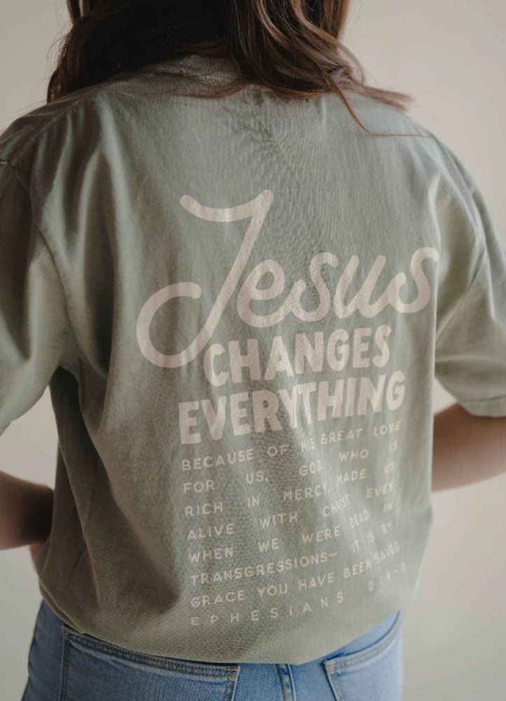This tee carries a message that speaks louder than words, yet wears effortlessly into everyday life. Featuring the bold reminder “Jesus Changes Everything” across the back, it blends faith and style in a way that feels authentic and approachable. The soft, lived-in fabric and relaxed fit make it an easy go-to—comfortable enough for daily wear, meaningful enough to spark conversation. Subtle scripture details add depth, pointing back to grace, mercy, and new life, all without feeling overdone. It's the kind of piece you reach for when you want your outfit to reflect what matters most, whether you're heading out the door or slowing down for the day. Styled with denim, layered under a jacket, or worn casually on its own, this tee fits seamlessly into real life. Simple, intentional, and full of purpose, it's a wearable reminder of hope, transformation, and truth that never goes out of style.