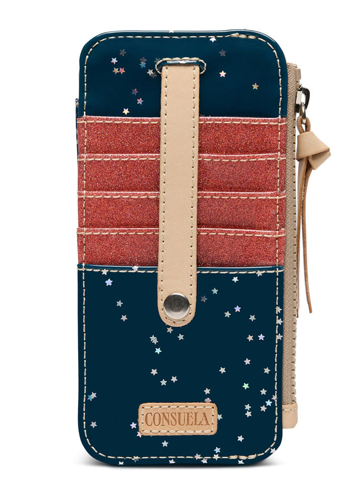 Shine bright with this starry Consuela cardholder and wallet, featuring glittery red stripes, multiple card slots, and a zippered compartment for stylish everyday organization.