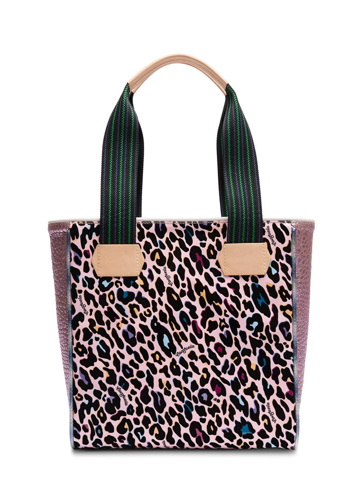 Make a fierce statement with the Consuela tote, featuring a playful multicolor leopard print, durable side panels, and sturdy woven handles. Spacious enough for all your essentials, this stylish carryall is perfect for everyday adventures or weekend getaways.