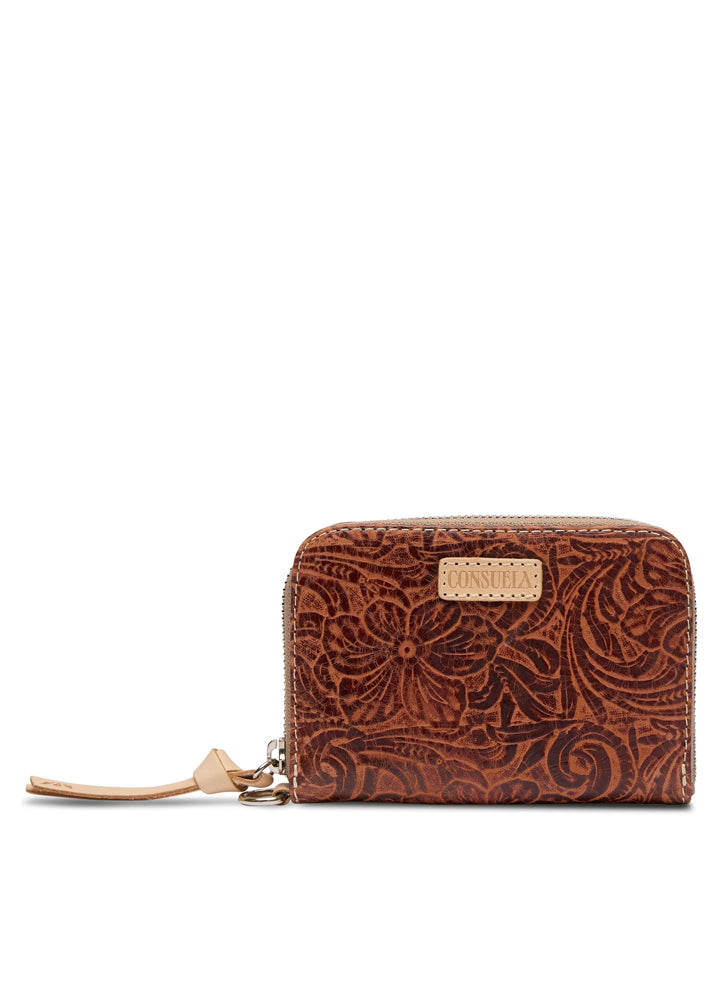 The new zippy wallet by Consuela is perfect for on the go. This small wallet features a tooled leather exterior with both interior and exterior card slots and a zip closure.