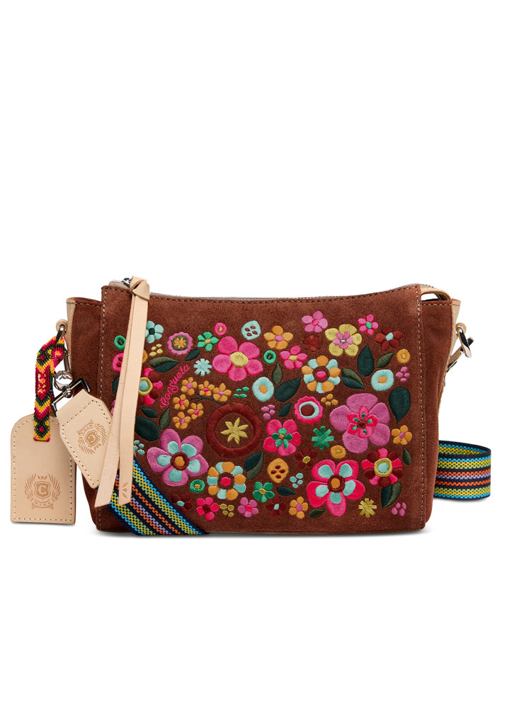 Add a burst of color to your everyday style with this Consuela crossbody, featuring intricate floral embroidery on rich brown suede. With a roomy interior lined in a cheerful yellow print and a vibrant woven strap, it blends artisanal charm with practical design.