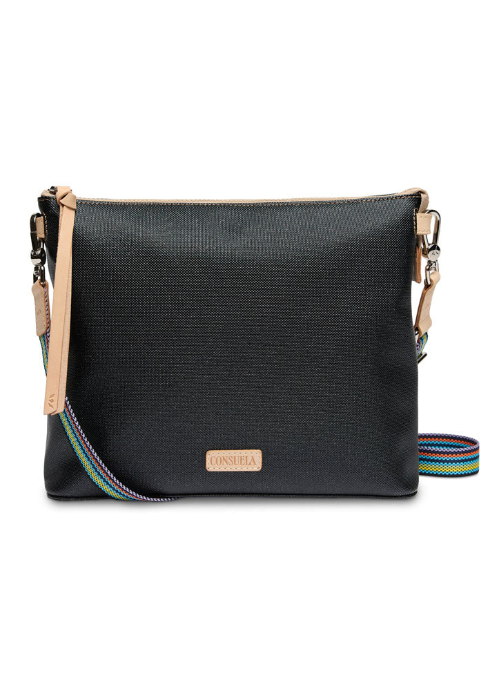 Effortlessly sleek, this Consuela crossbody pairs a classic black exterior with a colorful striped strap and roomy interior for everyday versatility.
