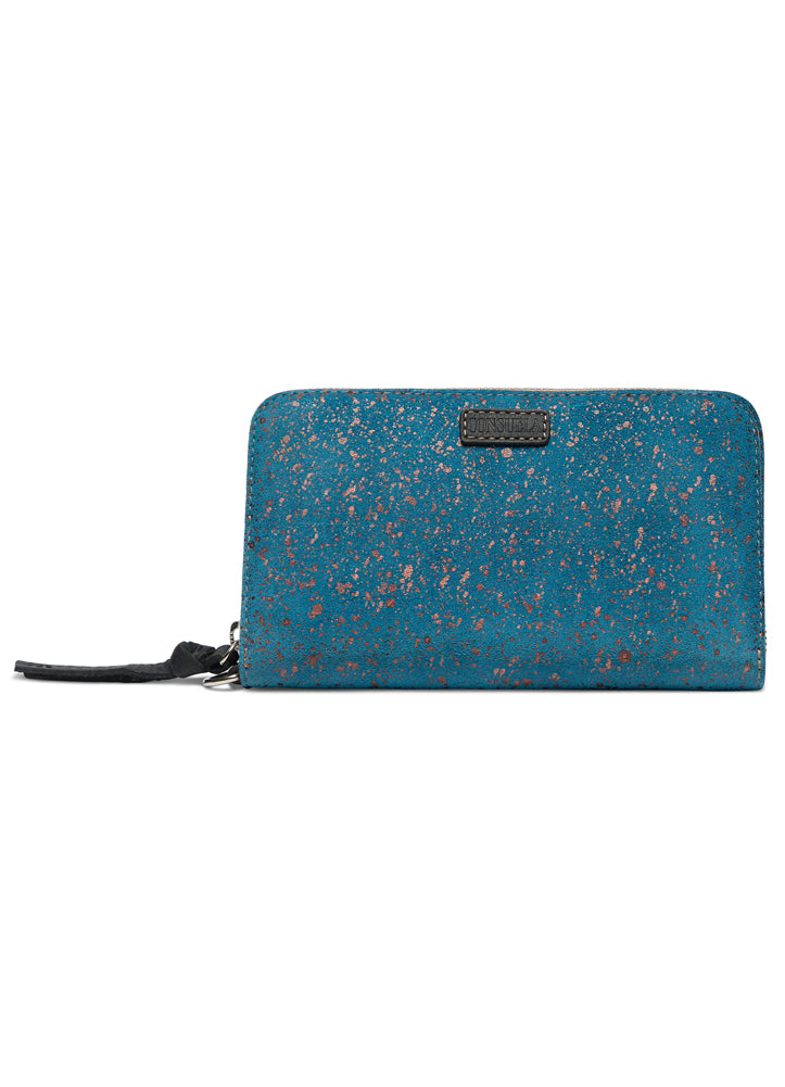 Turn heads with this chic Consuela zip-around wallet, crafted in a striking teal with copper flecks for a modern metallic finish. Designed with multiple compartments, card slots, and a secure zipper closure, it keeps your essentials organized while adding a bold pop of style.