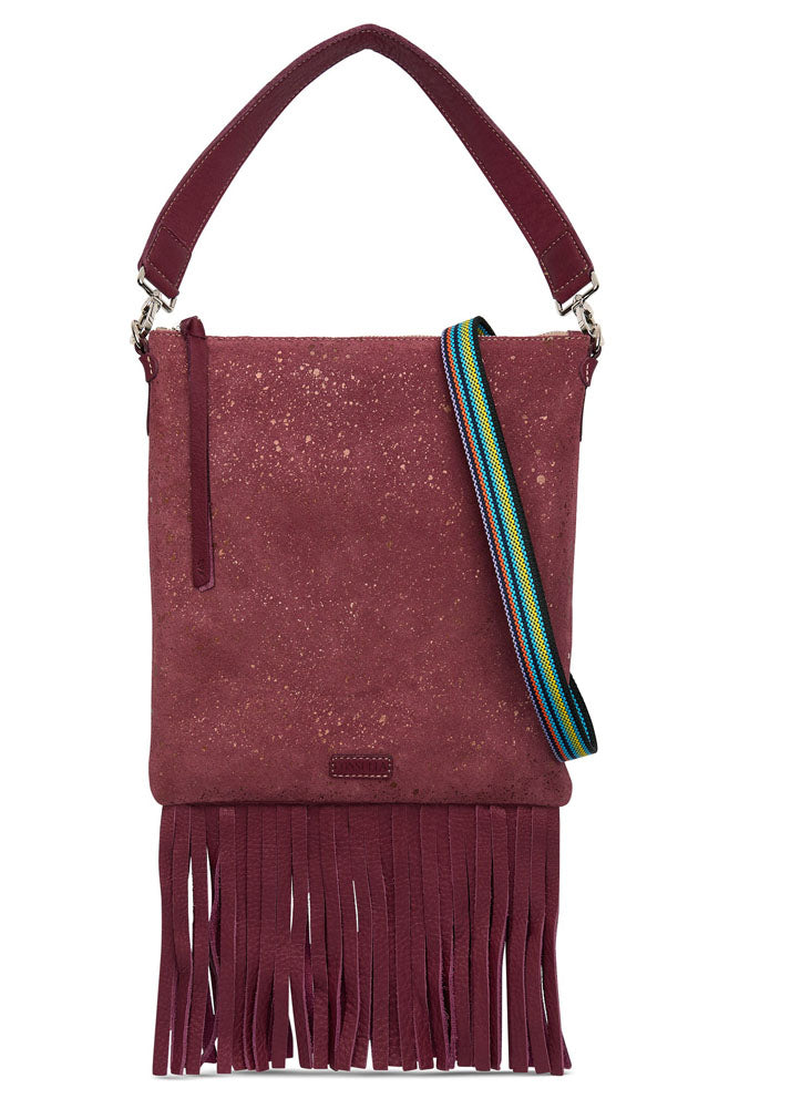 Add a bold touch of personality to your everyday style with this stunning burgundy fringe crossbody bag. Designed for the free spirit who loves effortless flair, this bag combines texture, movement, and a rich pop of color for a look that stands out in any crowd. The soft suede-like material is dusted with subtle metallic flecks, giving it a unique shimmer that elevates even the simplest outfit. A playful layer of long, flowing fringe adds boho charm, while the removable rainbow-striped strap brings an unexpected, vibrant twist that lets you switch from classic to colorful in seconds. The sturdy top handle provides versatility, making it easy to carry by hand or wear crossbody for hands-free convenience. With enough room for your essentials and a standout design that effortlessly blends fun and fashion, this bag is the perfect accessory to brighten your wardrobe and express your unique style wherever you go.