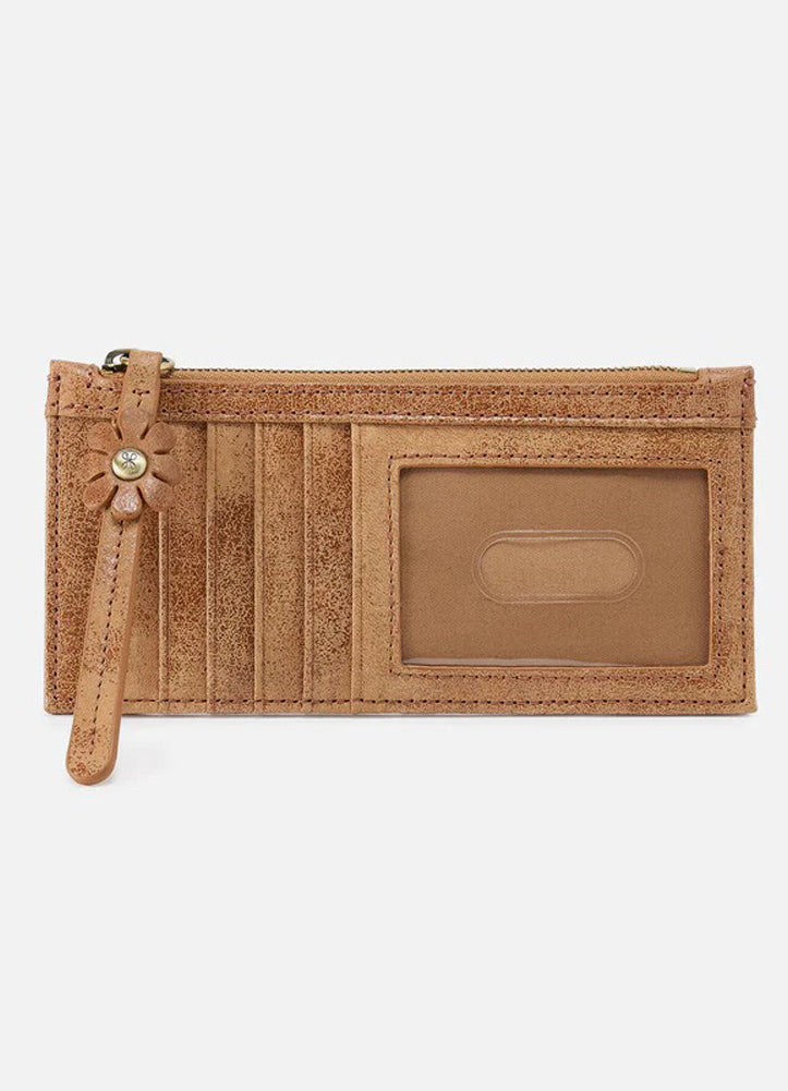 Crafted from distressed whiskey colored leather, this slim card case features several card slots, a clear ID window, and a zip pocket for coins or cash. Finished with a floral zipper pull and brass-tone hardware, it's compact, stylish, and perfect for everyday use.