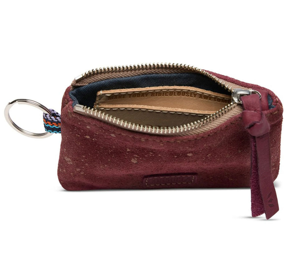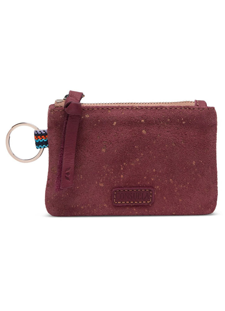 This compact maroon pouch blends soft suede texture with subtle speckled detailing, featuring a secure zip closure and convenient keyring attachment making it a stylish and practical way to keep your smallest essentials organized and within easy reach every day.