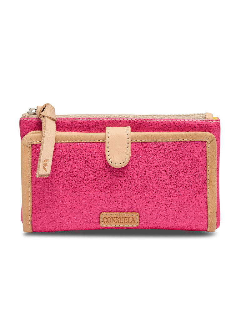 Add a pop of sparkle to your everyday with this pink glitter Consuela wallet, featuring multiple card slots, ID window, and secure zip closure for all your essentials.