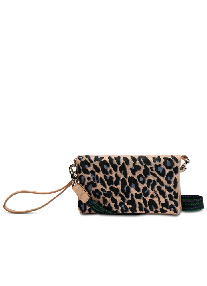 The Joss uptown crossbody by Consuela will become your favorite go to bag. This crossbody features a gold glitter and leopard design, a magnetic closure, three zipper pockets, credit card slots and an adjustable strap.