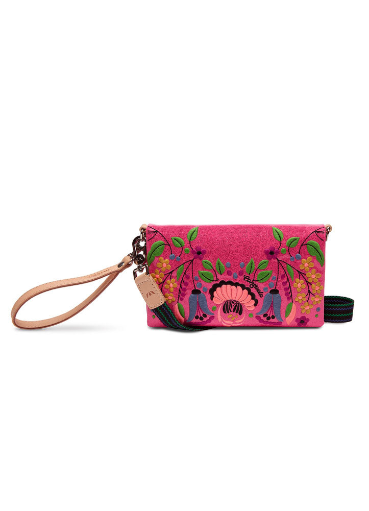 Celebrate color and craft with this embroidered Consuela wristlet, featuring vibrant floral details, secure zip compartments, and multiple card slots for stylish organization.