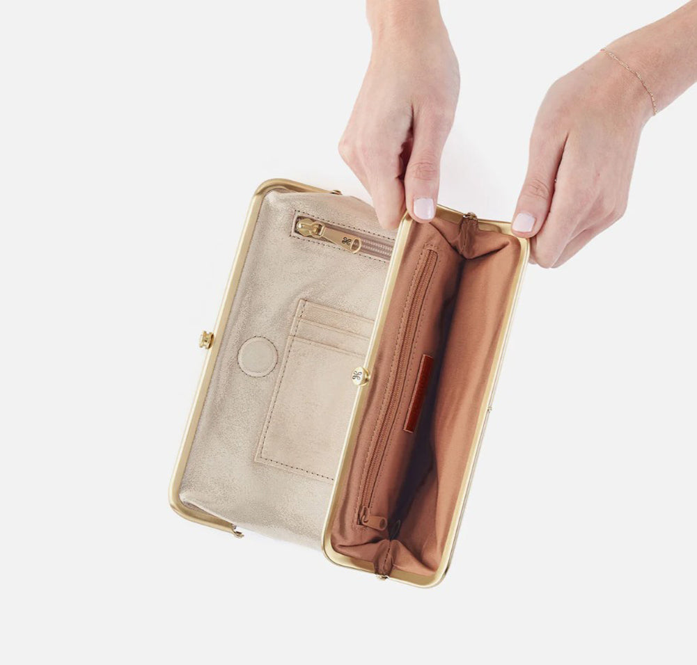 Carry your wallet essentials in style with this Lauren clutch in Sand Shimmer by Hobo. This clutch features gold hardware, interior card slots, zip pouch and two clasped side pockets.