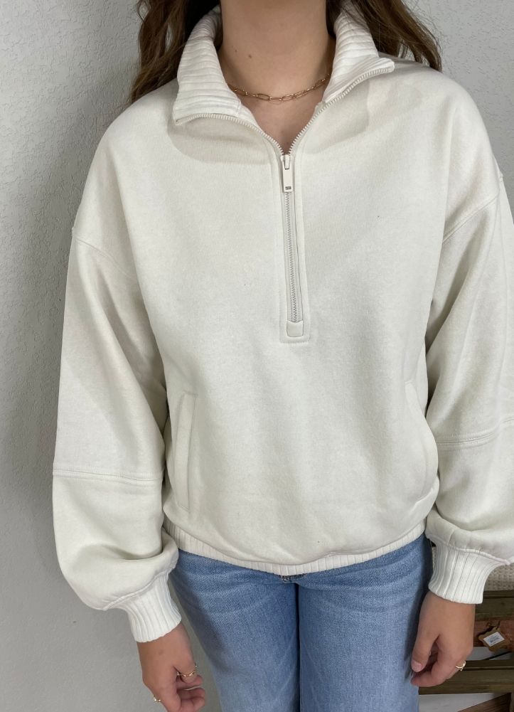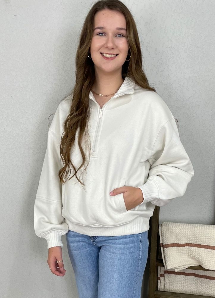 This quarter zip fleece top is sure to be a favorite grab and go option for the Fall and Winter. Featuring a front zip, a front kangaroo pocket and wide bottom and sleeve cuffs. The bone color is a perfect neutral to pair with leggings or jeans of any color.