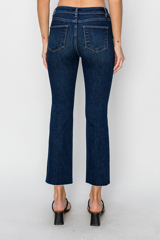 Step out in these comfortable and stylish jeans by Risen. They feature a mid rise, button fly, front and back pockets and has a cropped straight raw edge hem.