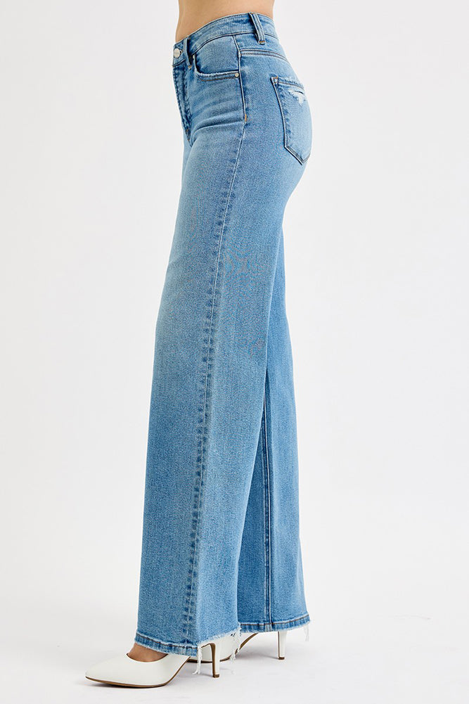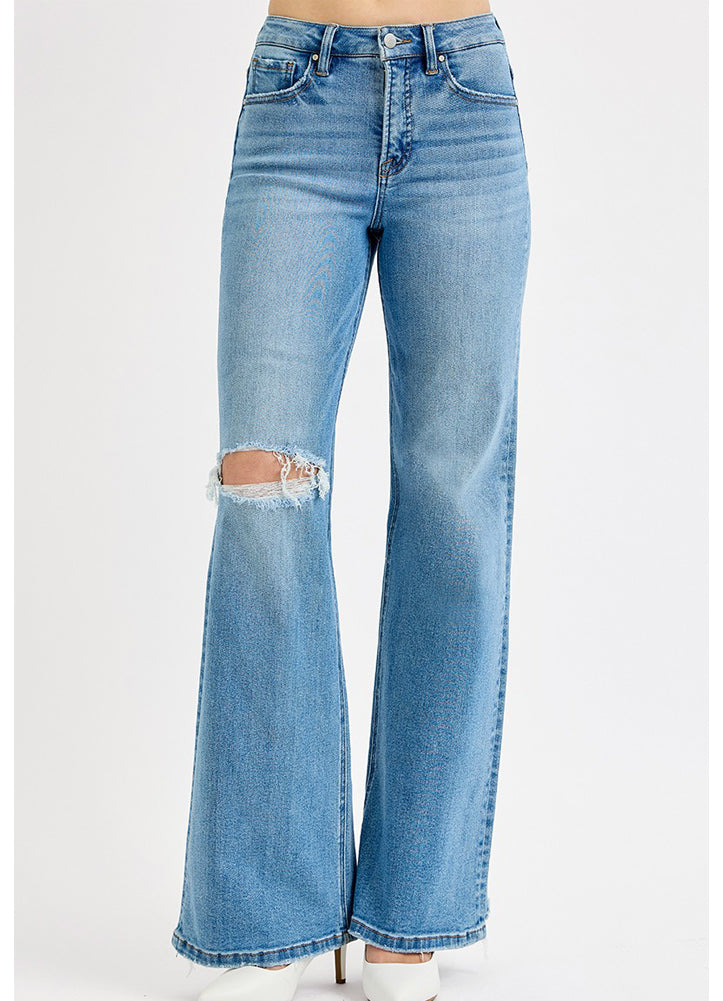 High-rise tummy control flare jeans in a light wash with subtle distressing and a knee rip, designed to smooth, sculpt, and flatter while giving a chic retro-inspired silhouette.