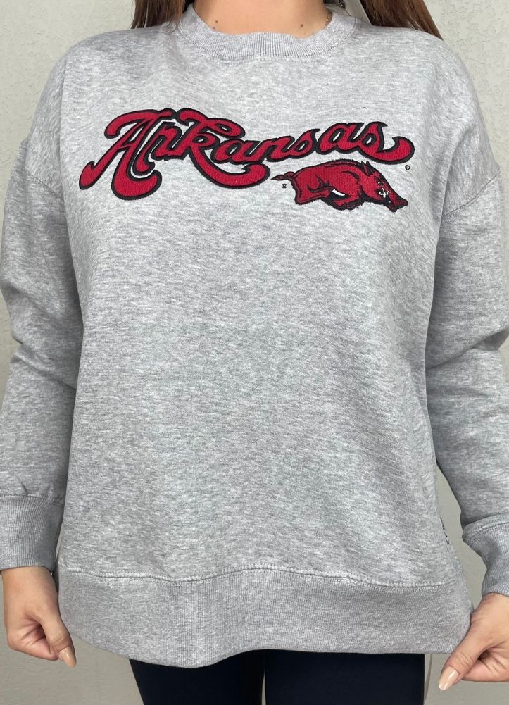 Show your team spirit in this classic heather gray crewneck sweatshirt featuring bold red “Arkansas” script and the Razorbacks logo. Designed with a relaxed fit and soft fleece interior, it's perfect for game days, campus wear, or cozy casual outings. A timeless fan favorite, this sweatshirt pairs effortlessly with jeans, leggings, or joggers for a spirited and comfortable look.