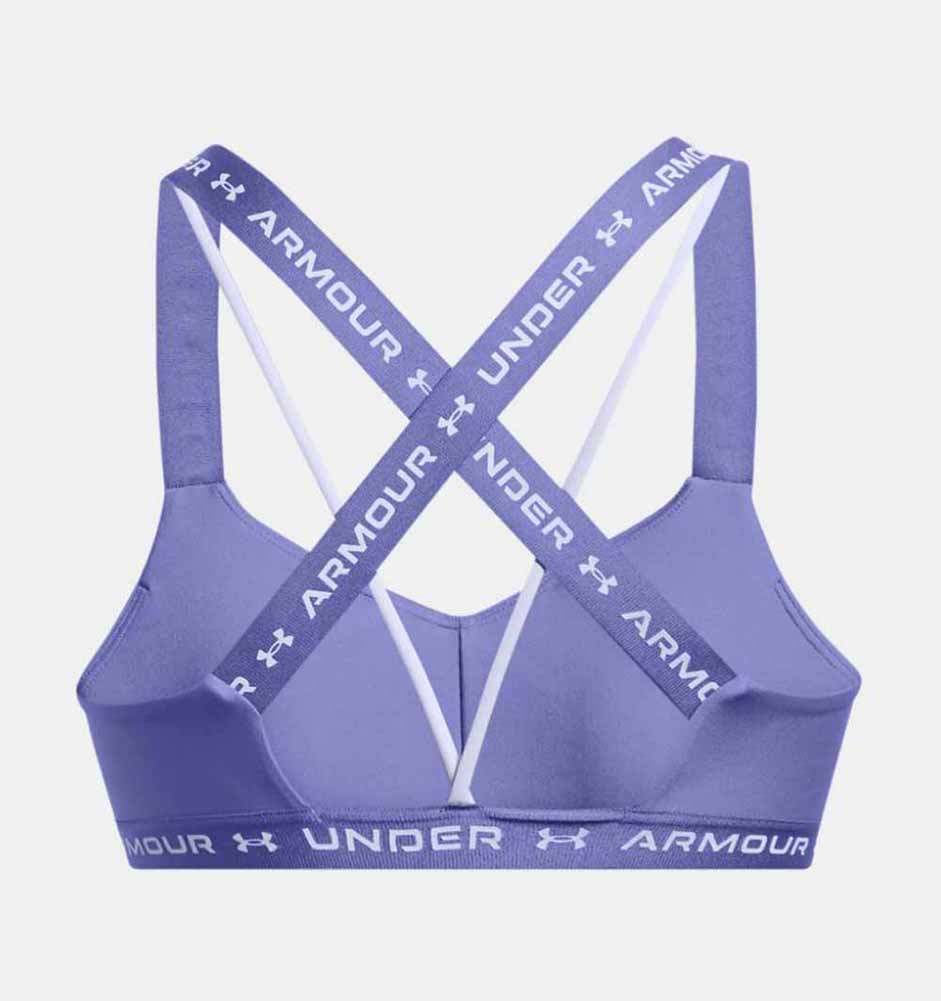 This sports bra brought to us by Under Armour offers total support and comes in the color purple. This sports bra features elastic straps and an elastic hem. The back of this sports bra features 2 straps that crossover to add additional support.
