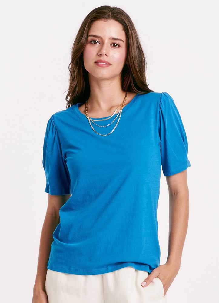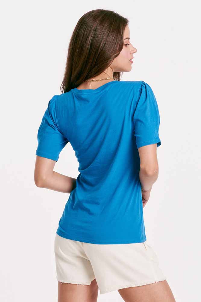 Go for a simple look by choosing this Scarlette top from Another Love. Designed in a horizon blue with short puffed sleeves. This top is light weight for layering under a cardigan. Pairs great with gold accessories.