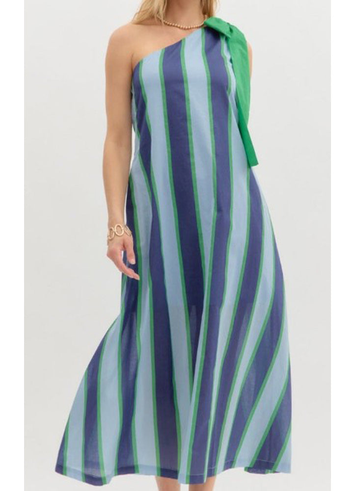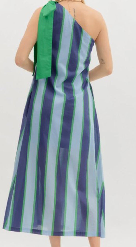 Make a statement with this elegant one-shoulder striped dress, designed to blend modern style with effortless sophistication. Featuring a flattering flowy silhouette, eye-catching vertical stripes in rich blue and green tones, and a chic shoulder tie detail, this lightweight dress moves beautifully with every step and is perfect for weddings, vacations, brunch dates, or special occasions where polished comfort is a must.