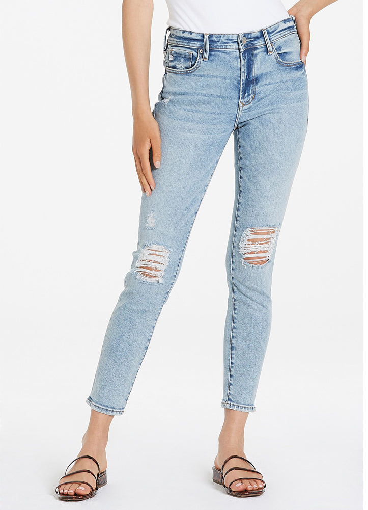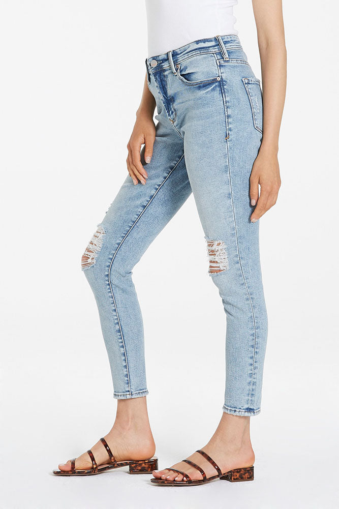 Dear John brings us the high rise Gisele Ankle Jeans in Atlantic Coast. These comfortable light wash skinny jeans feature a 5 pocket design, whiskering on the thighs and ripped distressing on the knees. Pair with sandals or sneakers for a great casual look.