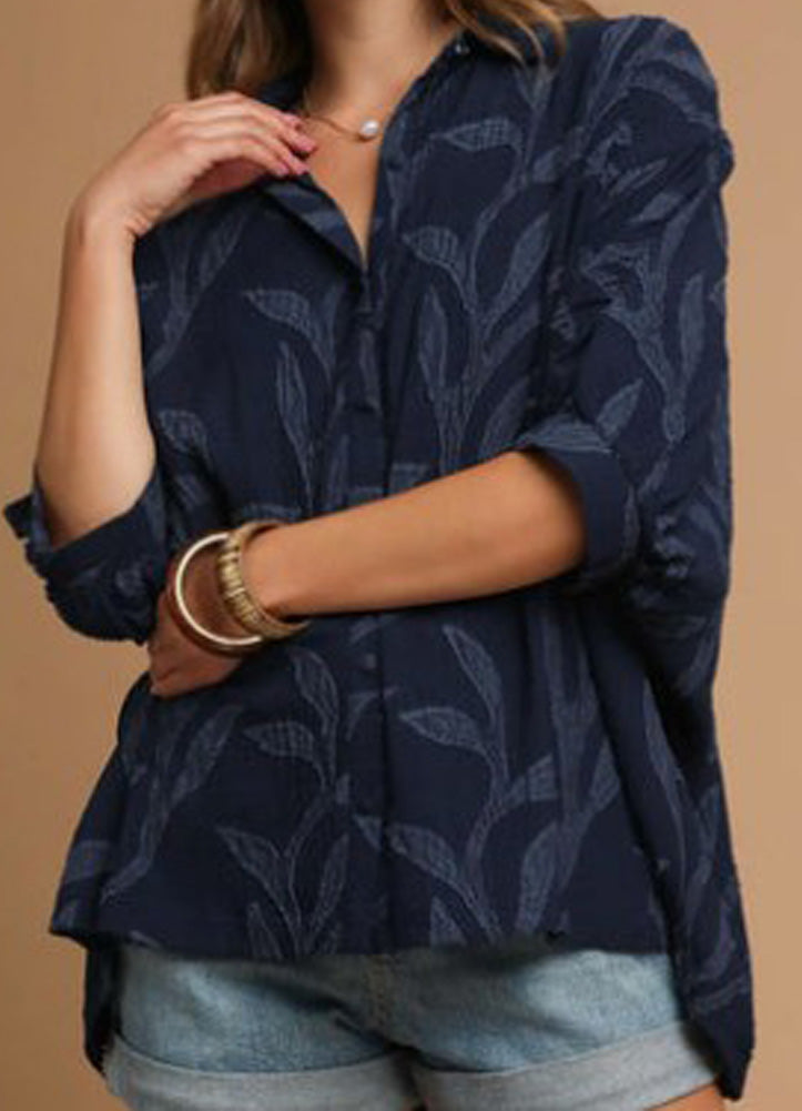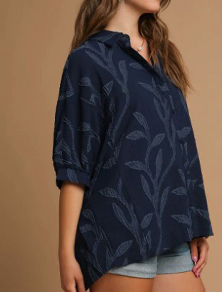 Jacquard Textured Leaf Button Down Blouse in Navy by Umgee