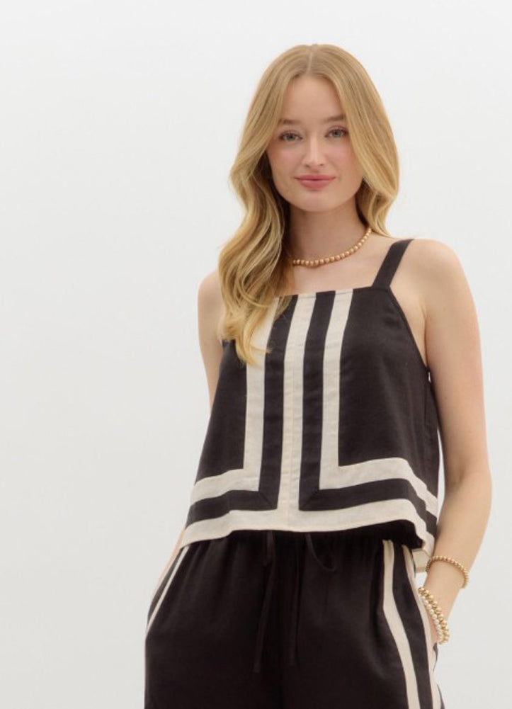 Make a modern statement in this sleek black tank top, featuring bold ivory geometric lines for an eye-catching contrast. With adjustable wide straps and a relaxed fit, this top blends minimalist edge with elevated comfort—perfect for pairing with the matching bottoms or styling solo.