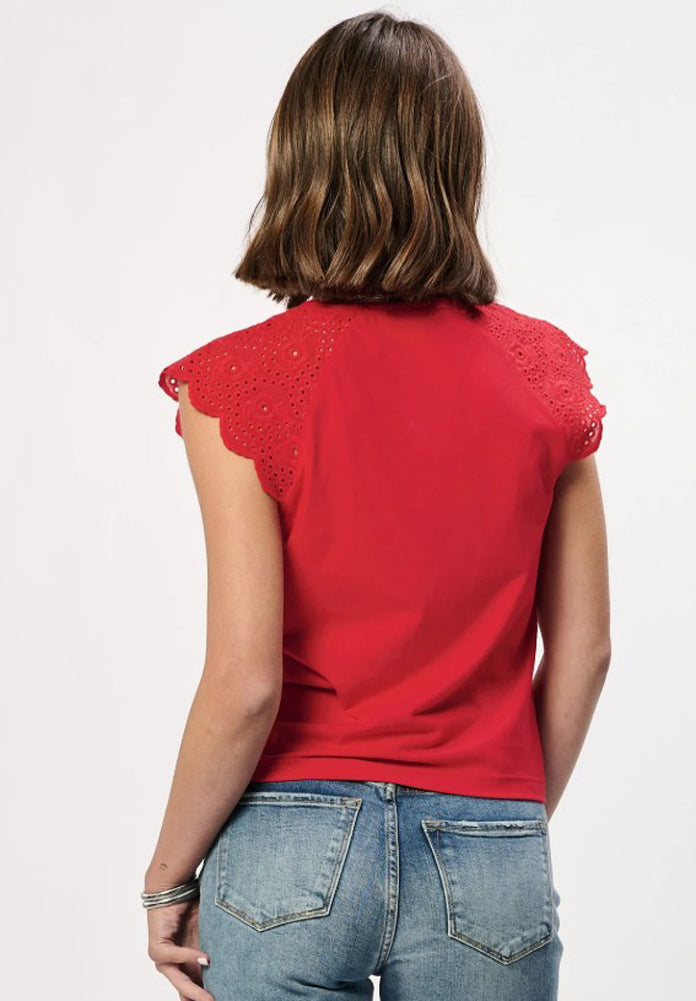 This vibrant red sleeveless top brings a feminine touch with eyelet flutter sleeves and a clean, tailored fit — perfect for dressing up denim or pairing with summer skirts.