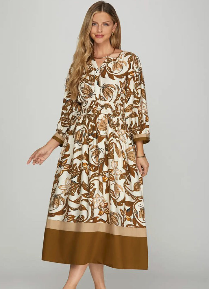 3/4 Sleeve Color Block Floral Midi Dress in Brown by She + Sky