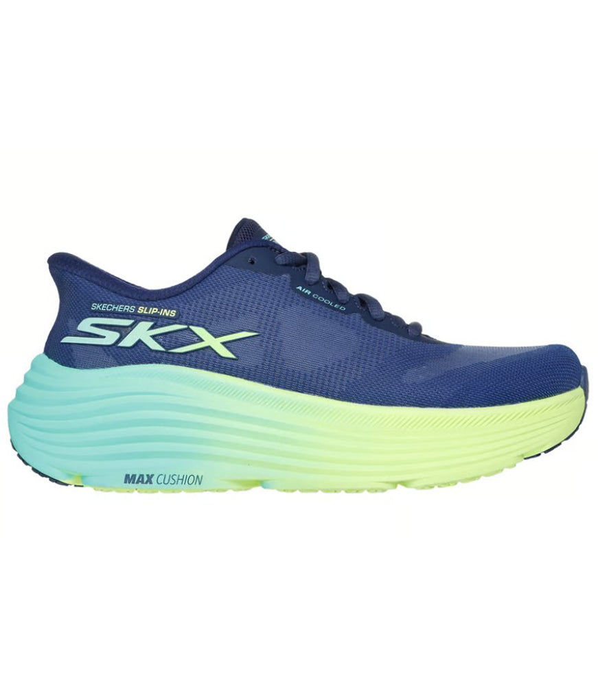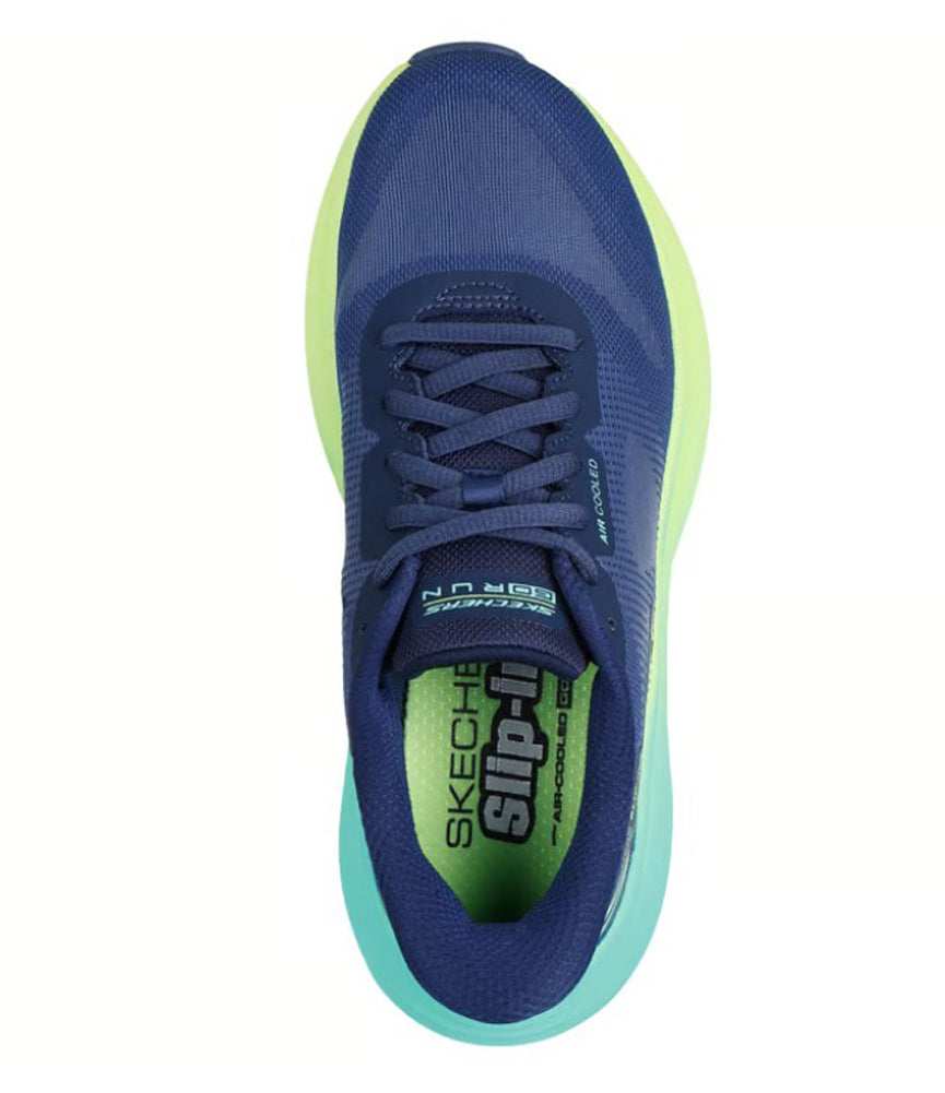 In a bold navy blue with a vibrant lime green sole, these Skechers SKX Slip-Ins deliver effortless style and performance, featuring breathable mesh uppers, Air-Cooled cushioning, and a slip-on design for all-day comfort.