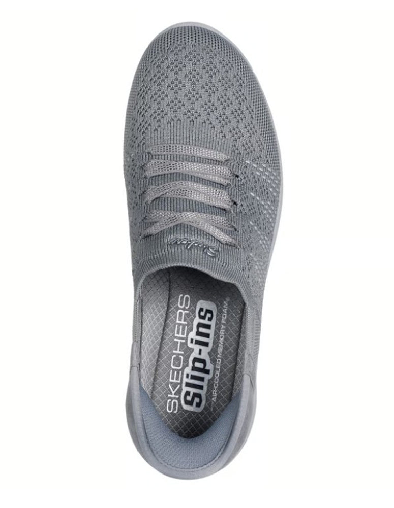 In a sleek light gray, these Skechers Slip-Ins offer effortless wear and modern style, featuring a breathable knit upper, flexible stretch laces, and cushioned midsole for all-day comfort.