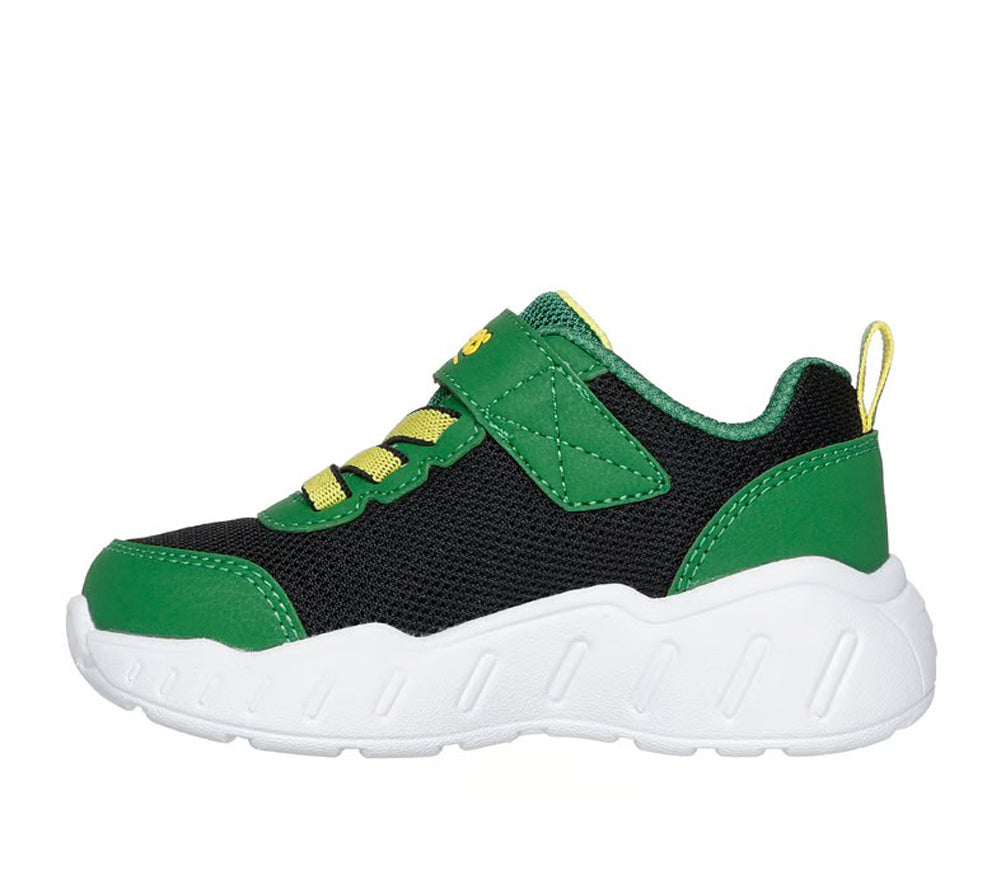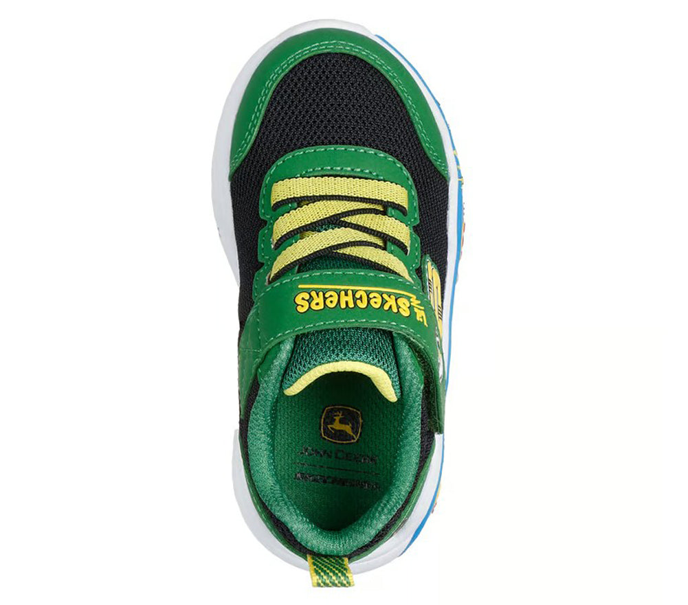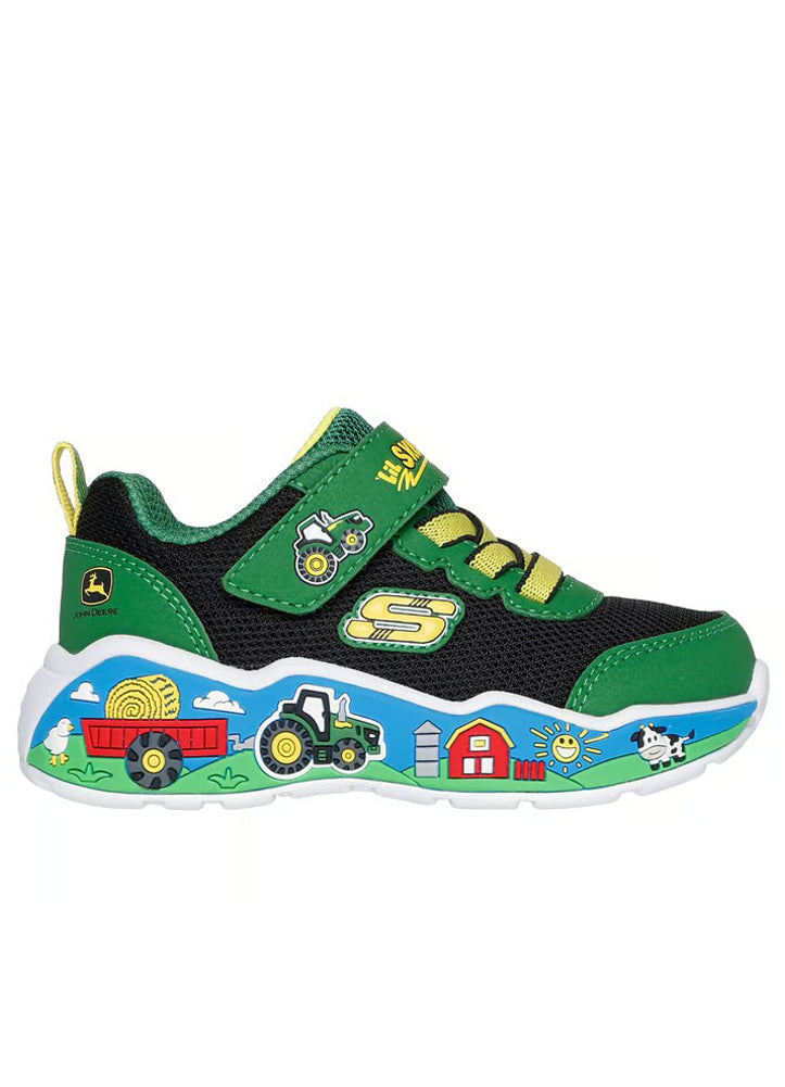 Farmyard fun at every step — these playful Skechers x John Deere kids' sneakers feature bright green and yellow accents, farm scene graphics, and easy hook-and-loop straps for all-day comfort and adventure.