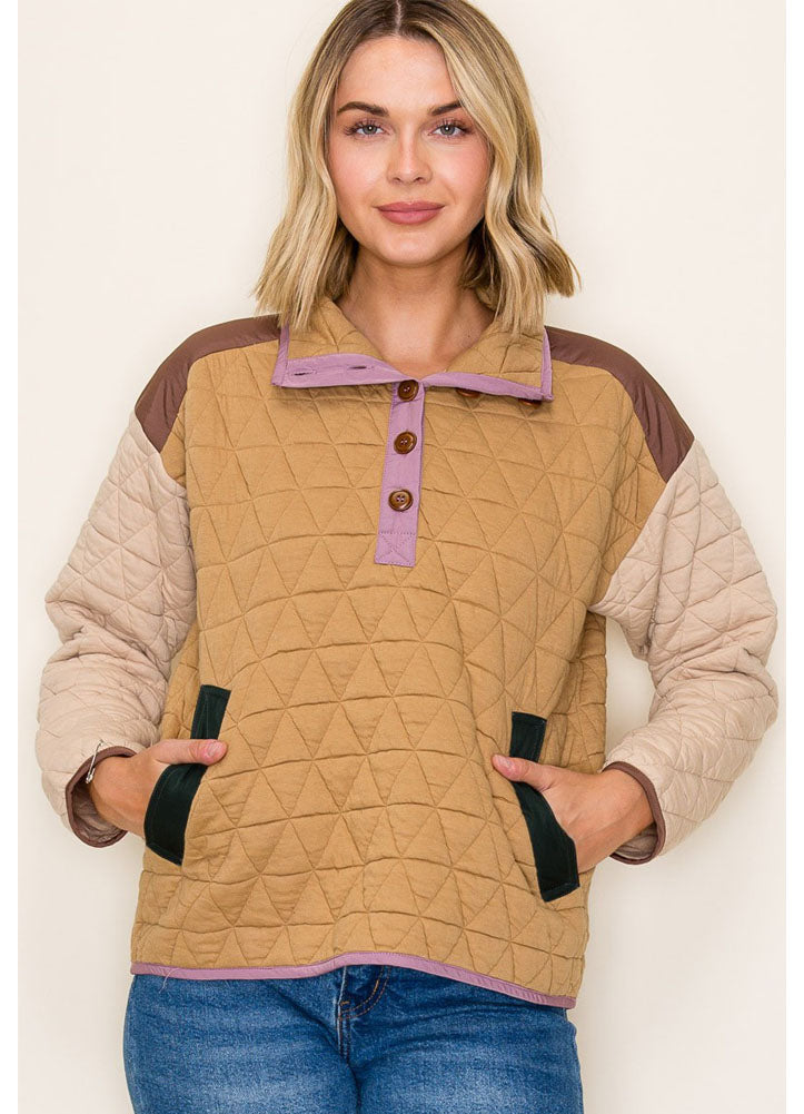 Stay cozy in this quilted pullover featuring a colorblock design with camel, taupe, and brown tones accented by a pop of lavender trim. Finished with button details and front pockets, it's the perfect blend of casual comfort and playful style.