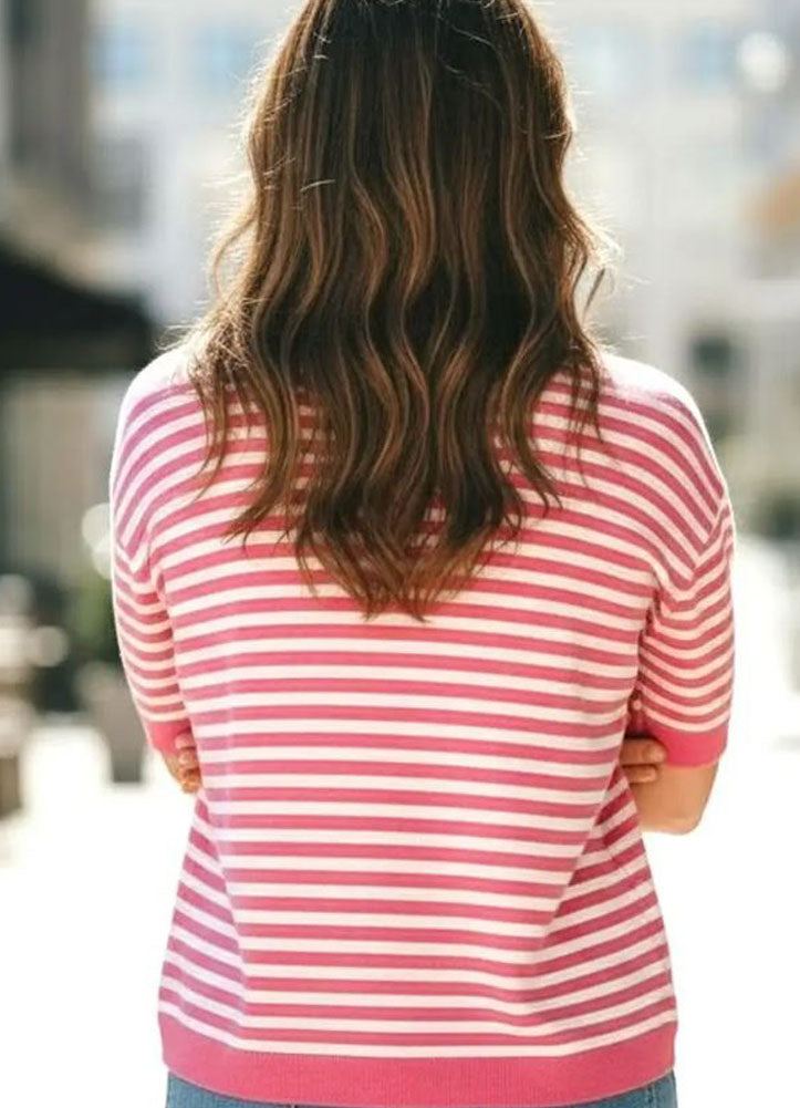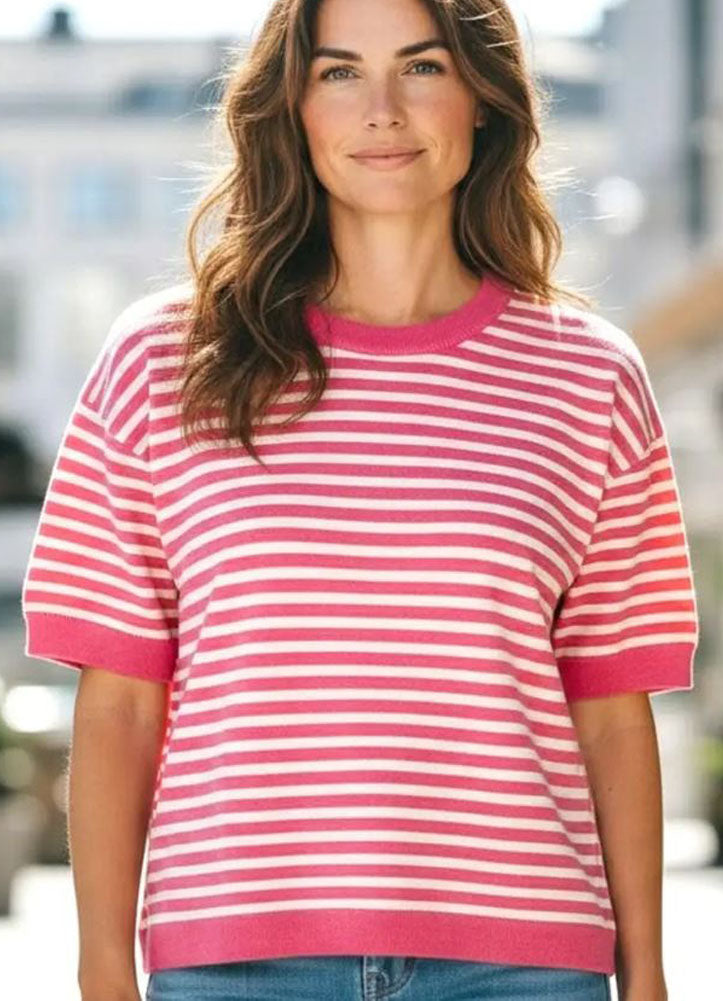 Brighten up your everyday style with this cheerful pink striped knit top. Featuring classic horizontal stripes in vibrant pink and soft white, this piece adds a playful pop of color to any casual look. The bold pink ribbed trim at the neckline, cuffs, and hem gives it a polished finish while adding subtle contrast and structure.