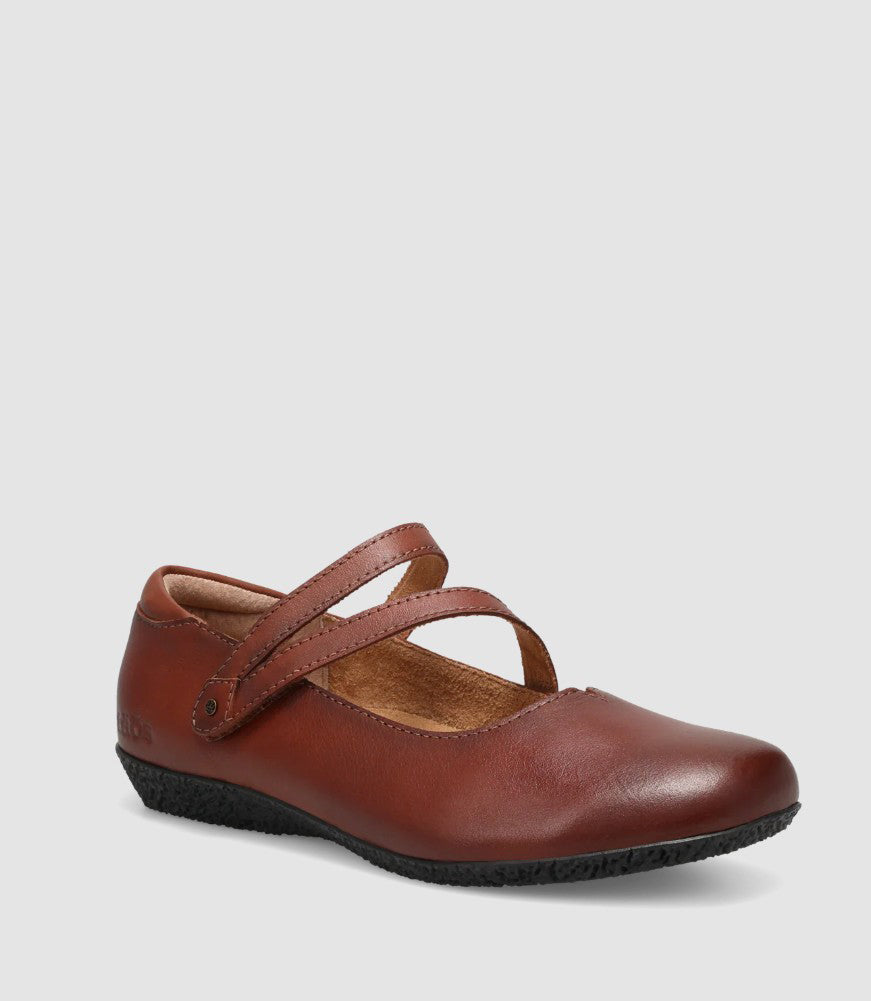 Simple yet timeless, this cognac leather Mary Jane flat features dual crossover straps, a soft cushioned footbed, and a flexible rubber sole. Delivering all-day comfort with effortless everyday style.