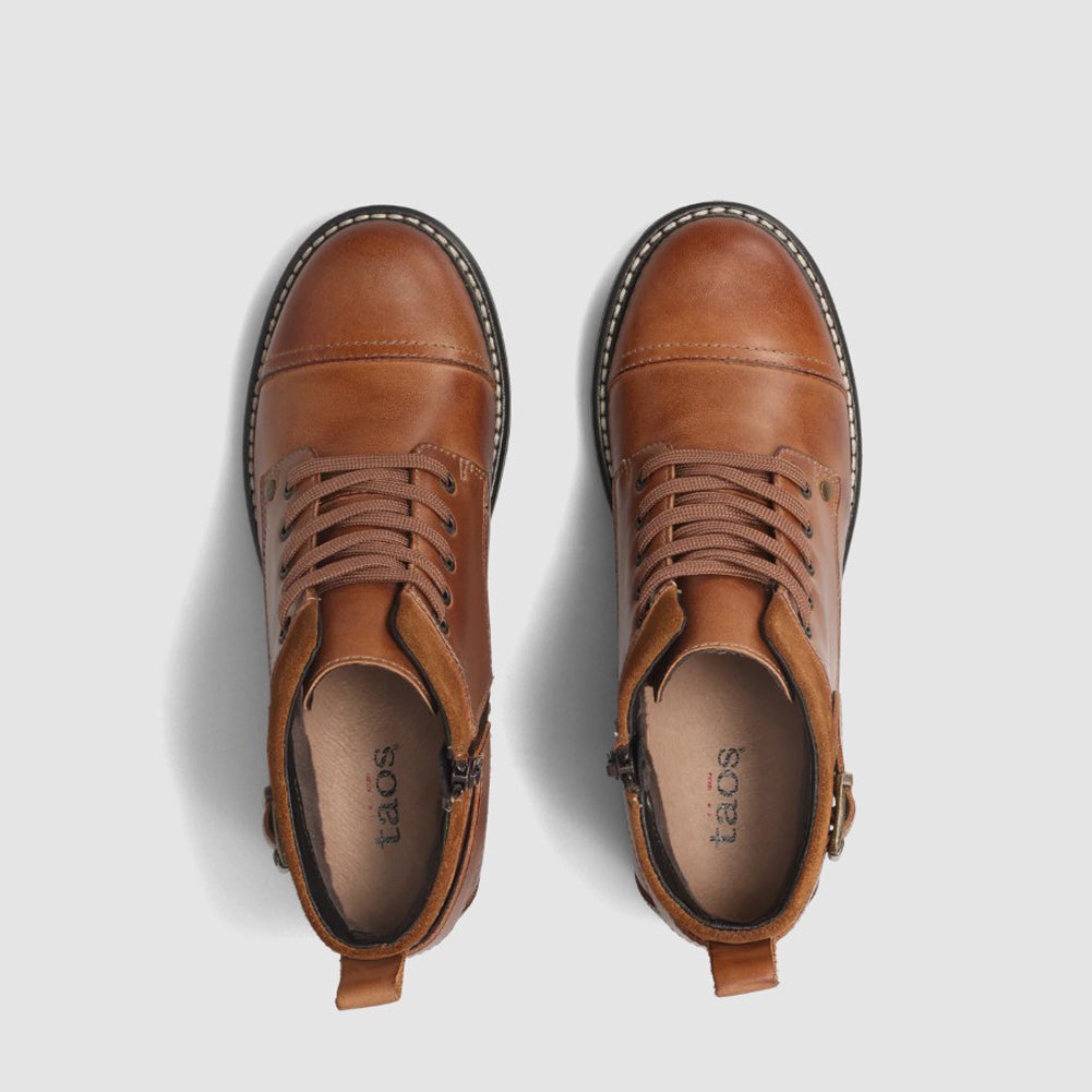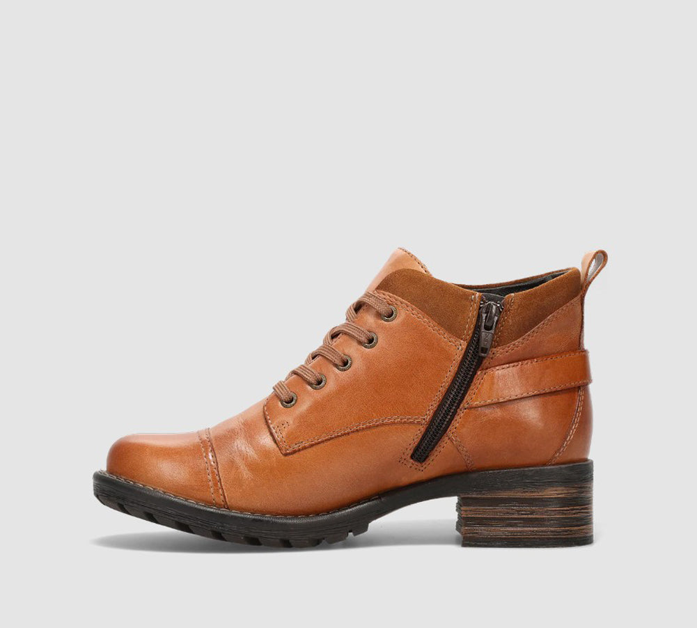 Rugged yet refined, this caramel leather ankle boot features a lace-up front with a side buckle detail, cushioned footbed, and durable lug sole. Delivering versatile style and all-day comfort from city streets to weekend adventures.