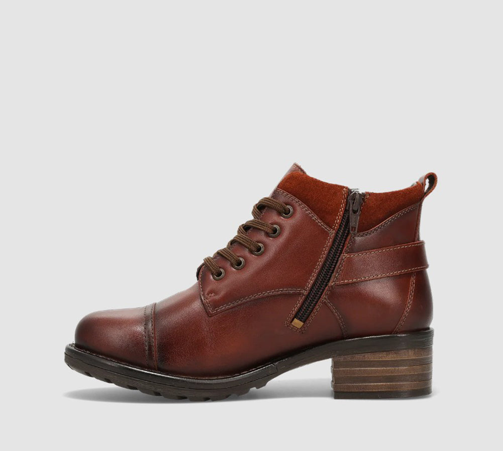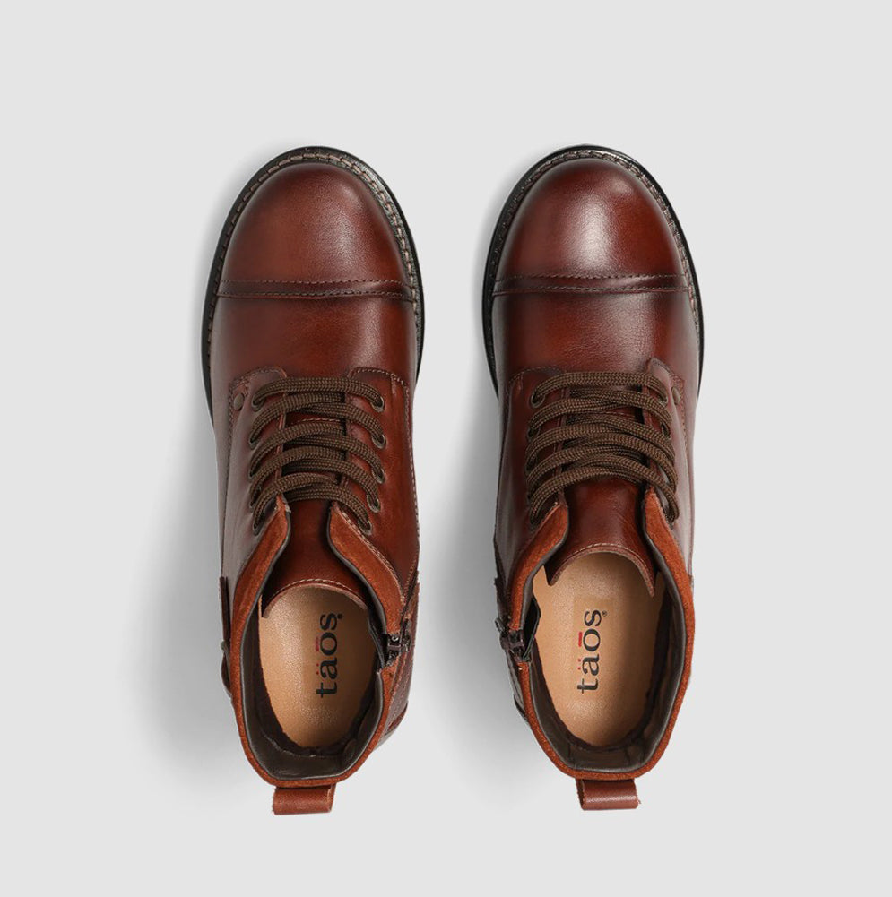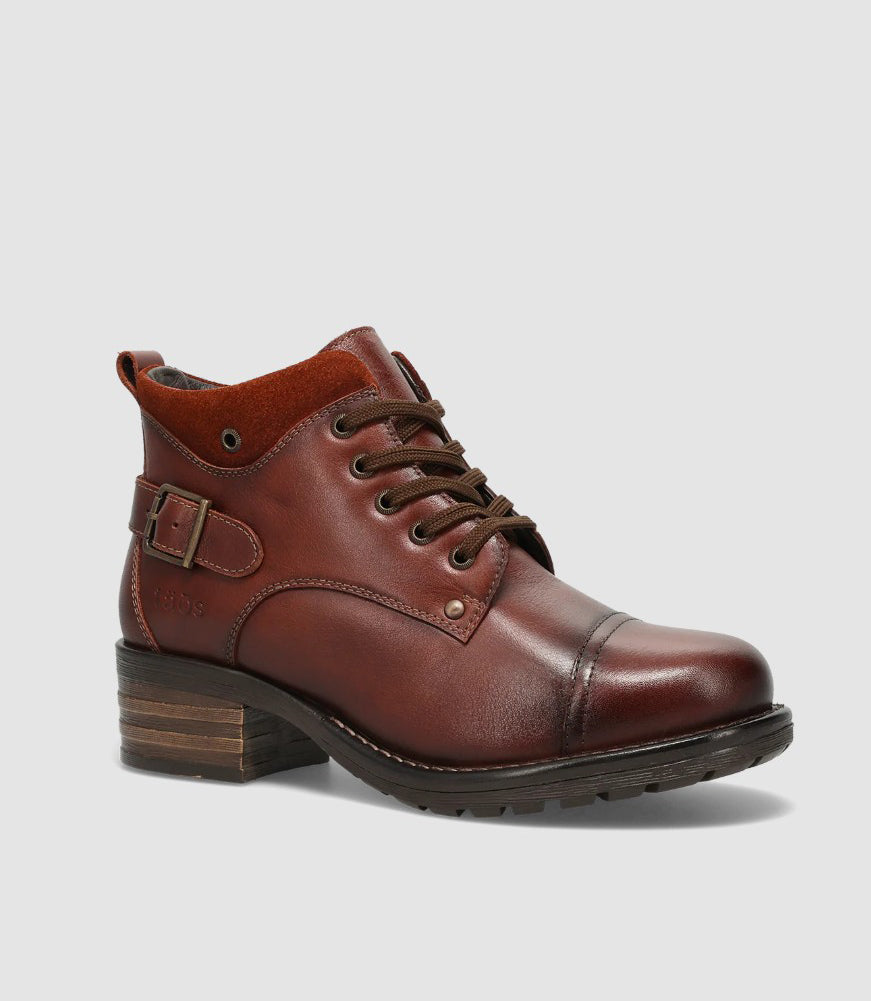 Rugged yet refined, this cognac leather ankle boot features a lace-up front with a side buckle detail, cushioned footbed, and durable lug sole. Delivering versatile style and all-day comfort from city streets to weekend adventures.