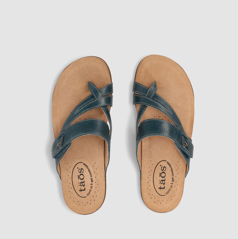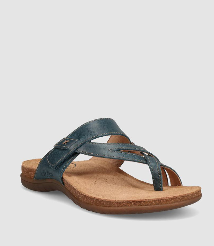 This patented premium leather toe loop thong sandal with a strappy upper design and adjustable hook and loop strap closure for the provides the ''perfect'' fit. Lightweight cork-latex midsoles are topped with soft padding and lined in luxurious suede, offering exceptional arch and metatarsal support.