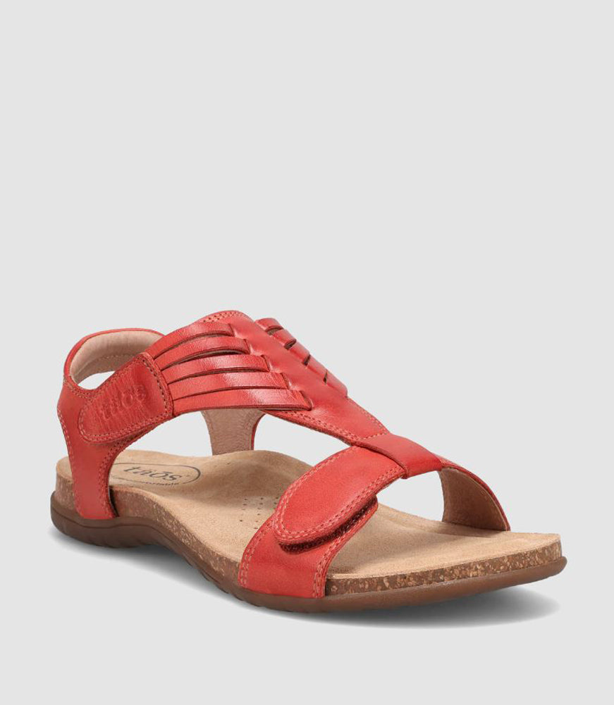 Bright and breezy, this red leather sandal features a woven T-strap design, cushioned contoured footbed, and adjustable hook-and-loop closure. Blending artisan style with all-day comfort for warm-weather wear.