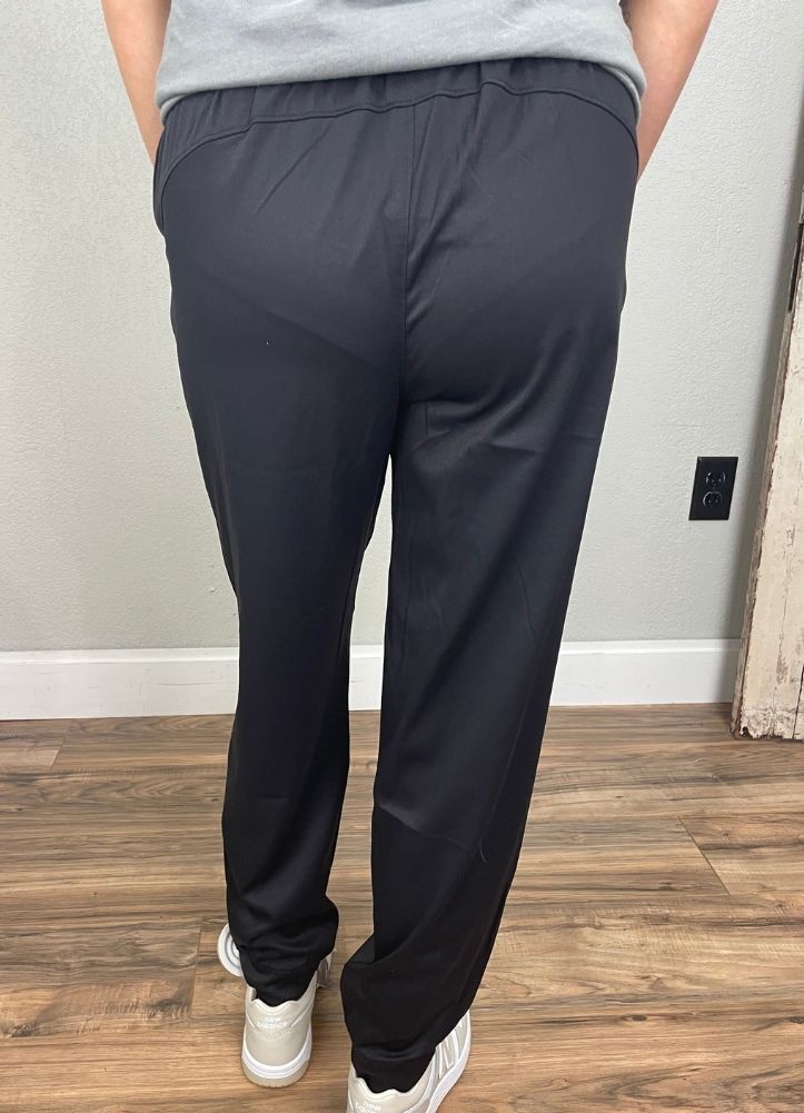 Keep it sleek and comfortable with these black pull-on pants, featuring a relaxed fit and elastic waistband for all-day ease. Designed with side pockets and a straight-leg silhouette, they offer a versatile look that can be dressed up with blouses or kept casual with tees and sneakers. A wardrobe staple, these pants bring effortless style to any occasion.