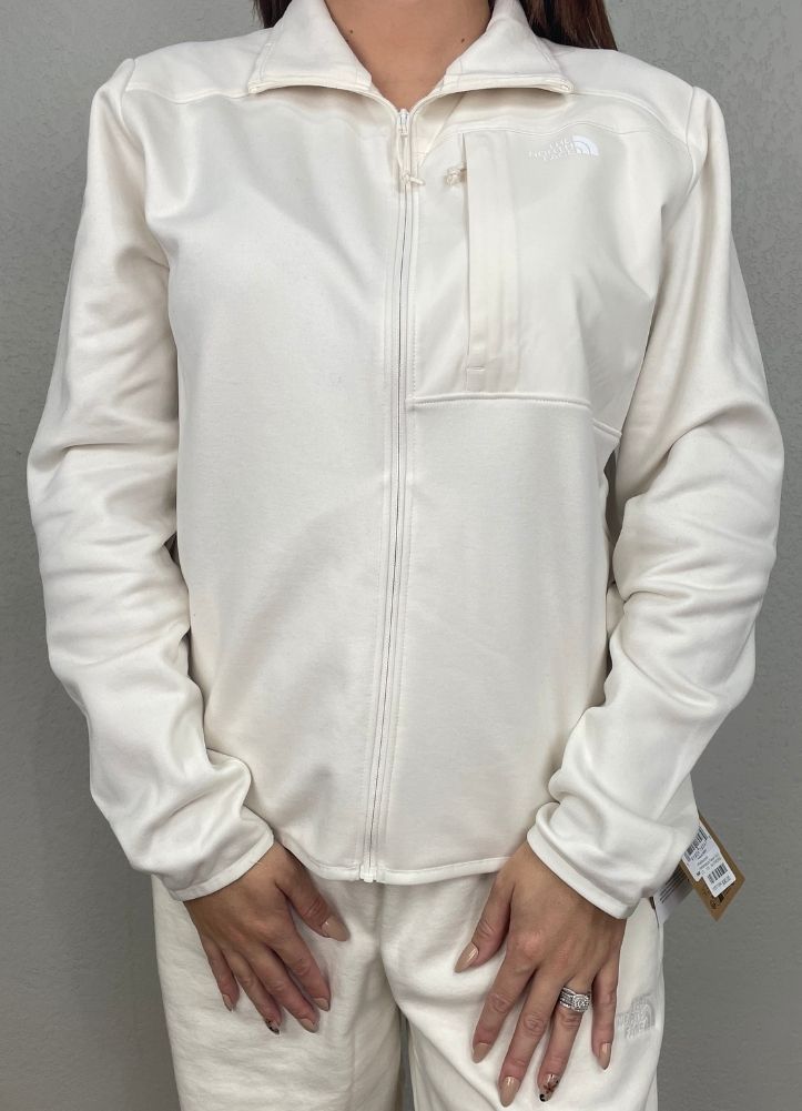 Stay warm and polished in this cream full-zip jacket from The North Face, designed with a sleek silhouette and soft, cozy fabric. Featuring a high collar, chest pocket detail, and subtle logo embroidery, it's perfect for layering on chilly days. Both functional and stylish, this versatile jacket pairs effortlessly with joggers, jeans, or leggings for an elevated casual look.