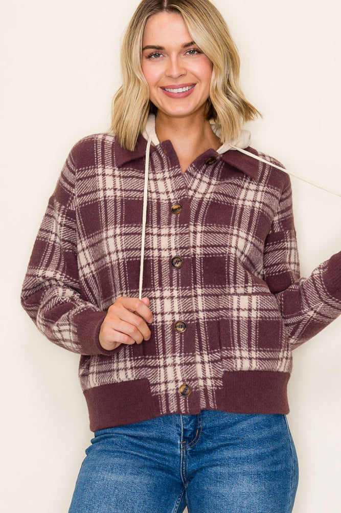 Layer up in cozy charm with this brown plaid button-up jacket, featuring a soft textured fabric, relaxed fit, and classic collared design. Perfect for adding warmth and timeless style to your everyday look.