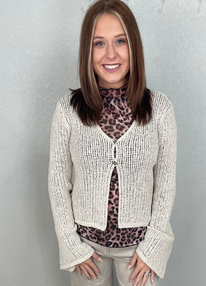 Bell Sleeve Front Button Crochet Cardigan in Natural by Blu Pepper